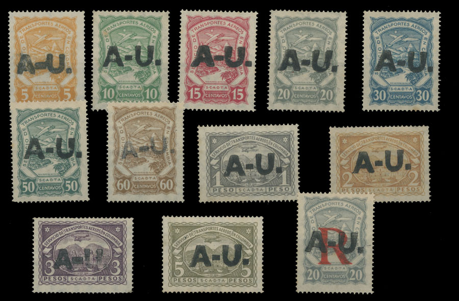1923, SCADTA ”A-U” (Argentina – Uruguay) overprints on air post issue of 1923, set of 12, including a single of 60c with 5mm overprint, all others with overprint of 7½mm high, occasional soiling and foxing mostly on reverse, full OG, approximately a half stamps are NH, others – LH, F/VF, C.v. $1,940 as hinged, Est. $800-$900, Scott #CLAU7, CLAU12/ 22, CFLAU2