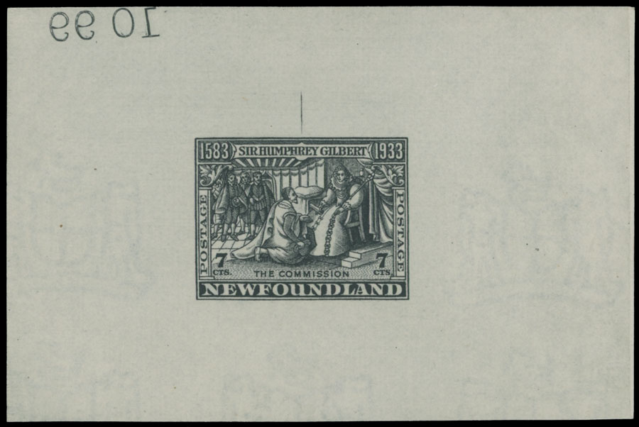 1933, Gilbert Receiving Royal Patent, die proof of 7c in black, printed on watermarked paper, printer’s marking at top, size 80x52mm, mirrored number ”1099” at upper left corner, no gum as issued, VF and rare, NSSC 200dp7, C.v. US$700, Est. $300-$350, Scott #217