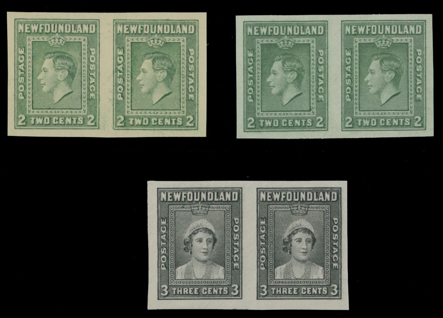 1938, King George VI and Queen Elizabeth, imperforate proofs of 2c in green and 3c in black, two horizontal pairs printed on paper without watermark, in addition 2c green, imperforate pair on watermarked paper, no gum as produced, NH, VF, Unitrade #245a, C.v. CAD$200 plus NSSC 228i, 229m, C.v. US$720, Est. $300-$350, Scott #245-46, 245a