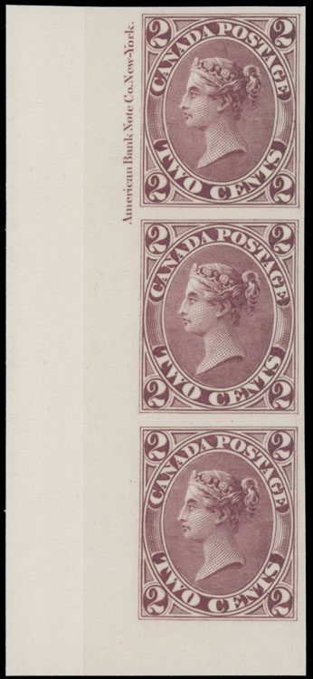 1864, Queen Victoria, imperforate trial color proof of 2c in claret, left sheet margin vertical strip of three with ABN imprint, produced on India paper mounted on card, sheet positions are penciled on reverse (71-81-91), fresh, VF and scarce positional piece, Unitrade #20TCi, C.v. $1,050++, Est. $300-$350, Scott #20