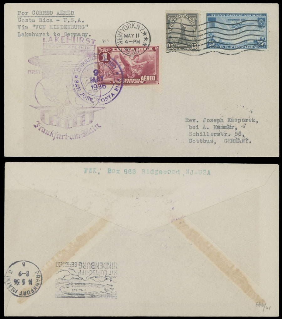 1935 (May 11-14), 1st North America Airship Hindenburg Return Flight mixed franking cover from San Jose, franked by 1c deep rose and upon arrival to US uprated by two values, violet US confirmation marking and Frankfurt ”14.5.36” receiver on the back, VF and rare, Sieger #409L, C.v. €1,200, Est. $500-$600, Scott #C24