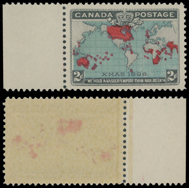 1898, Map of the British Empire, 2c black, deep blue and carmine, left sheet margin single, perfect stamp in every respect, full OG, NH, XF+, C.v. $125, Unitrade C.v. CAD $225, Est. $100-$120 , Scott #86b