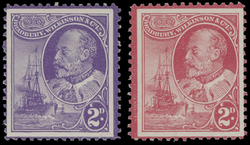 1903, Portrait of King Edward VII and Warship HMS King Edward VII, two perforated (L12) Bradbury, Wilkinson Co., Ltd essays of 2p in violet and carmine, King’s portrait is close to issued stamps of No.89-95, full OG, NH, VF and rare, Est. $400-$500