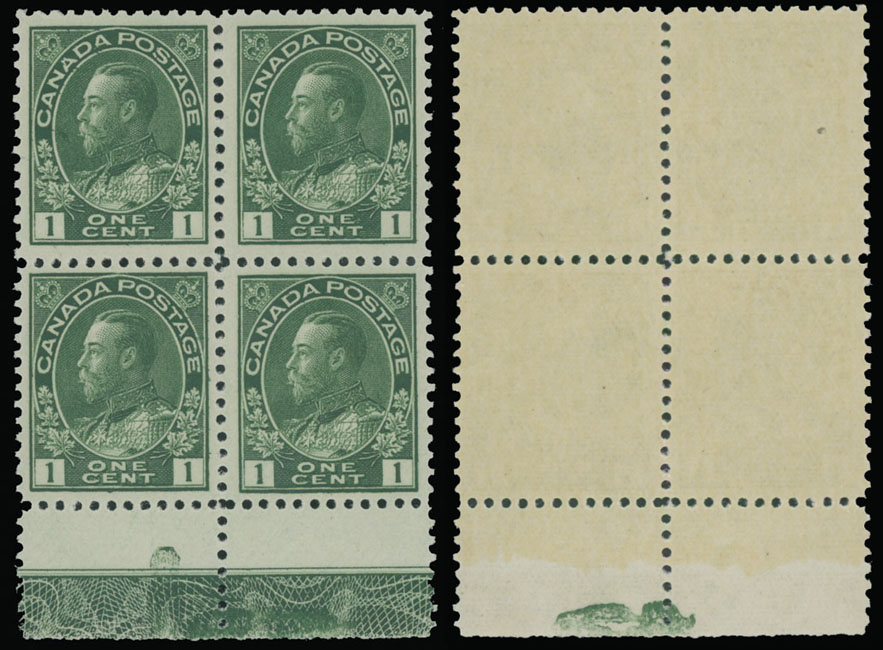 1916, 1c green, wet printing, bottom sheet margin block of four with double B lathework, nice and fresh, full OG, NH, VF, Unitrade C.v. CAD $1,800, Est. $400-$450 , Scott #104
