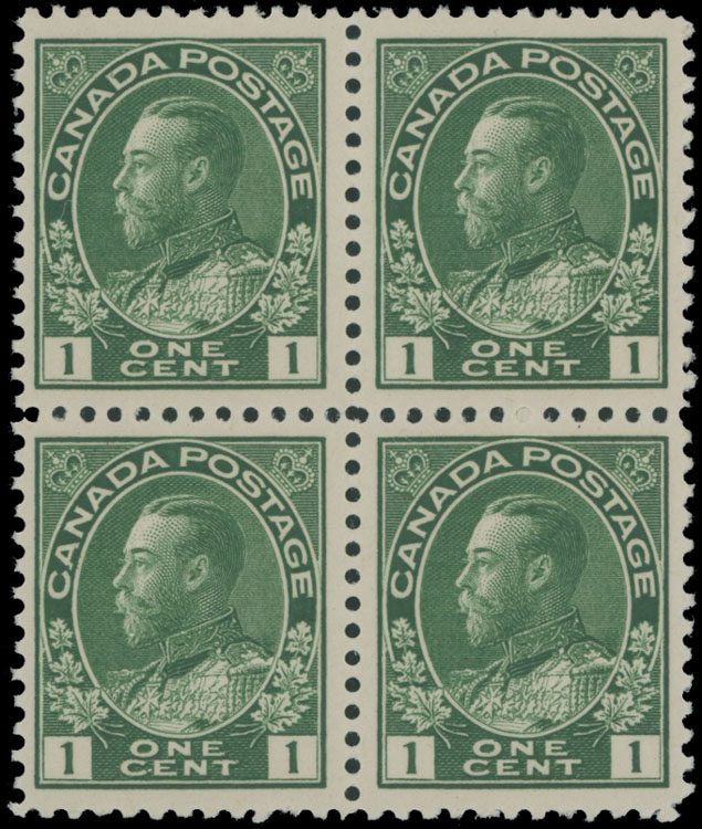 1920, 1c dark yellow green, wet printing, nicely centered block of four, full OG, NH, VF, Unitrade #104ii, C.v. CAD $720++, Est. $200-$250 , Scott #104 var