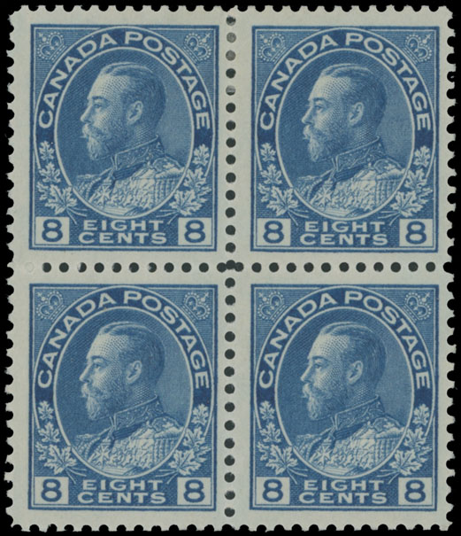 1925, 8c light blue, dry printing, nicely centered block of four, full OG, NH (bottom stamps) or hinged, VF, C.v. $280++, Unitrade #115i, C.v. CAD$640 as singles, Est. $150-$180 , Scott #115 var