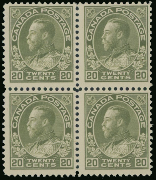 1925, 20c olive green, dry printing, block of four, very fresh condition, full OG, NH, fine centering, C.v. $1,160++, Unitrade C.v. CAD$600 as singles, Est. $200-$250 , Scott #119