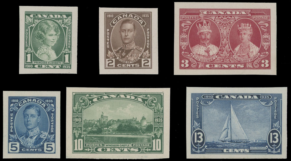 1935, imperforate plate proofs in issued colors, 1c-13c, complete set of six printed on India paper and mounted on cards, penciled numbers on reverse, no gum as produced, NH, VF, Unitrade C.v. CAD$750, Est. $200-$250, Scott #211-16