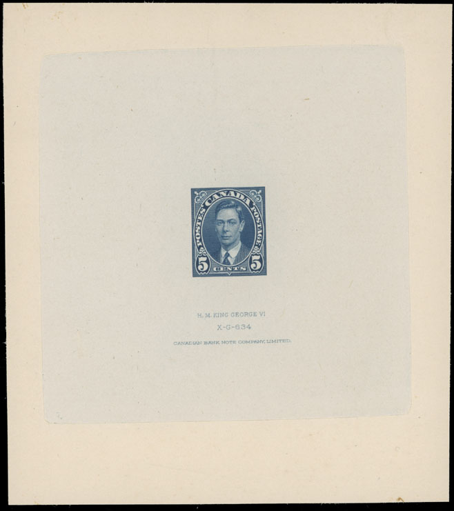 1937, Mufti issue, large die proof of 5c in blue on India paper placed on sunken die card, imprint at bottom reads: ”H.M. King George VI. X-G-634. Canadian Banknote Company, Limited”, proof size 83x87mm, fresh, VF and rare, Minuse and Pratt #235P1, NSSC 196dp1, C.v. US$1,200, Est. $600-$700, Scott #235