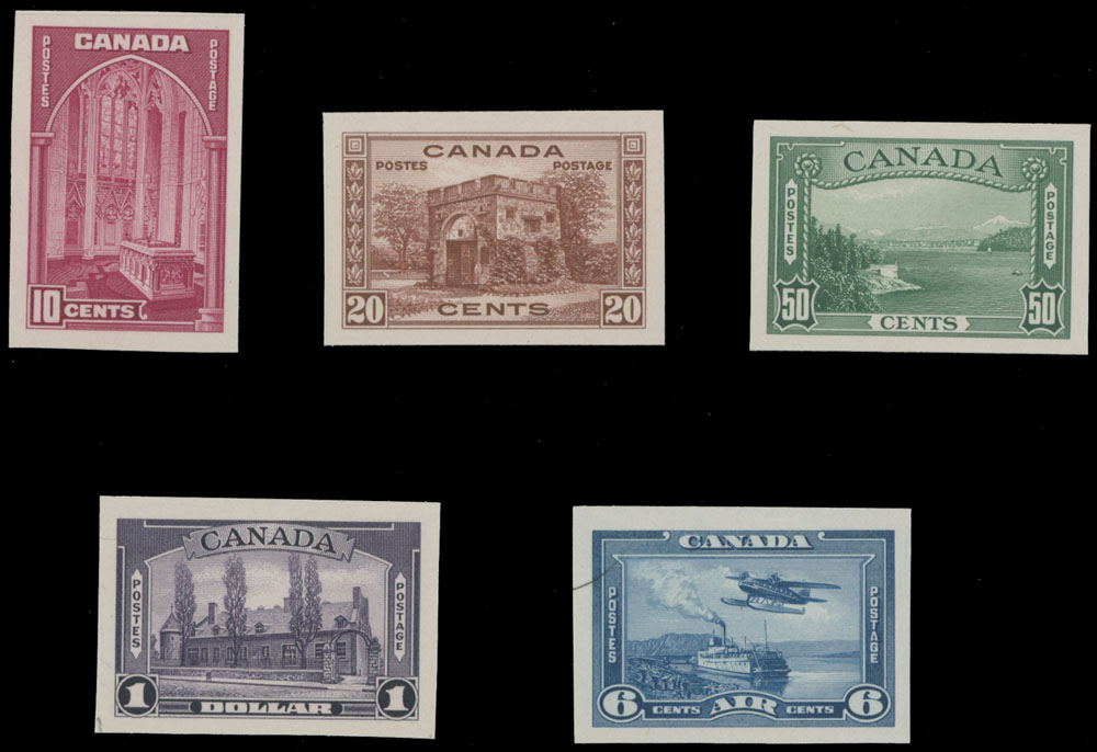 1938, Pictorial issue, imperforate plate proofs in issued colors, 10c-$1 and Air 6c, complete set of five printed on India paper and mounted on cards, no gum as issued, NH, VF, Unitrade C.v. CAD$800, Est. $250-$300 , Scott #241-45, C6