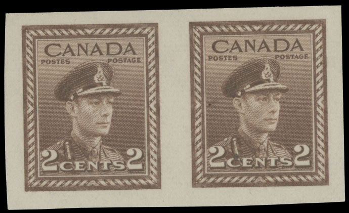1942, War issue, 2c brown, horizontal imperforate pair, nice margins, full OG, NH, VF, C.v. $400, Unitrade C.v. CAD$600, Est. $250-$300 , Scott #250c