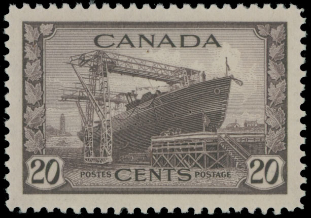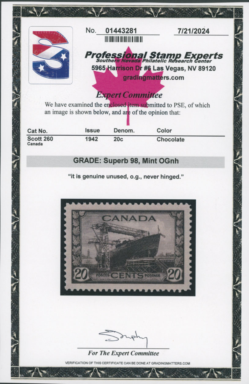 1942, War issue, Corvette, 20c chocolate, full OG, NH, SUP98, PSE certificate, Unitrade C.v. CAD$22.50, Est. $100-$120 , Scott #260
