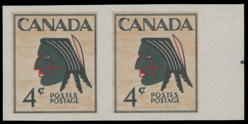 1950(c), Indian Head imperforate essay of proposed design for multicolored 4c definitive stamp, right sheet margin horizontal imperforate pair, printed on gummed stamp paper, NH, VF, Est. $200-$250