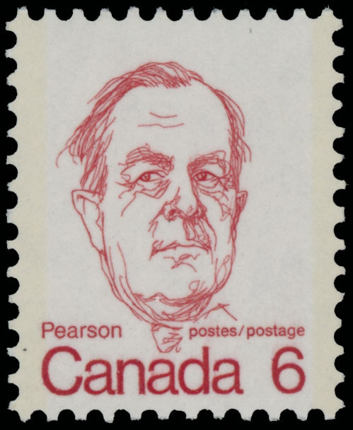 1973, Lester Pearson, 6c dark red, printed on gum side variety, appropriate tagging on gum side also, NH, VF, C.v. $180, Unitrade C.v. CAD$250, Est. $100-$120 , Scott #591a