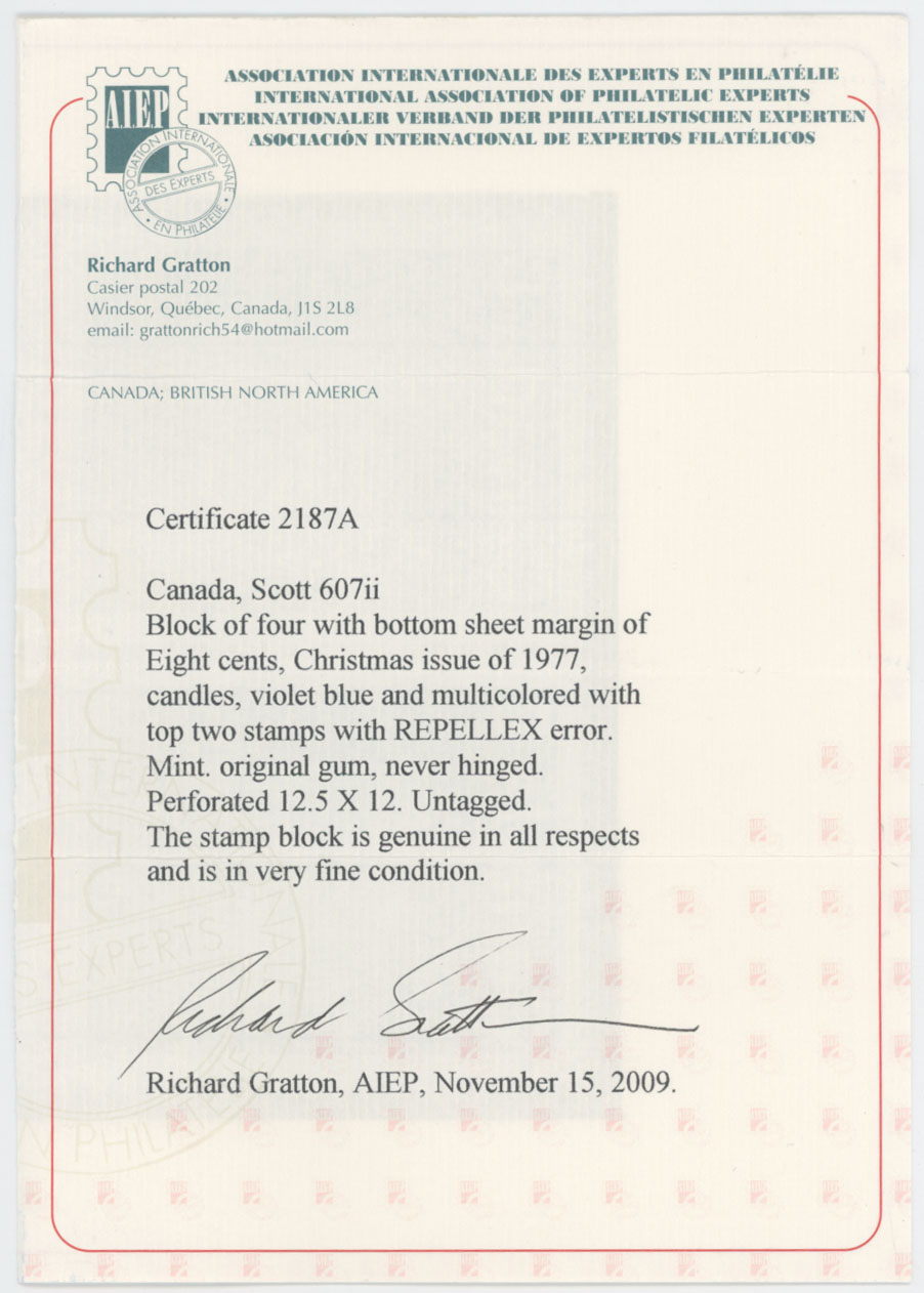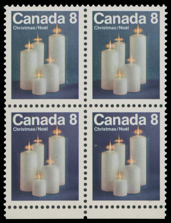 1972, Christmas issue, Candles, 8c multicolored, bottom margin block of four with repellex error (two top stamps with background in blue instead of deep violet), full OG, NH, VF and scarce multiple, R. Gratton certificate, Unitrade #607ii, C.v. CAD$1,000, Est. $300-#350, Scott #607 var