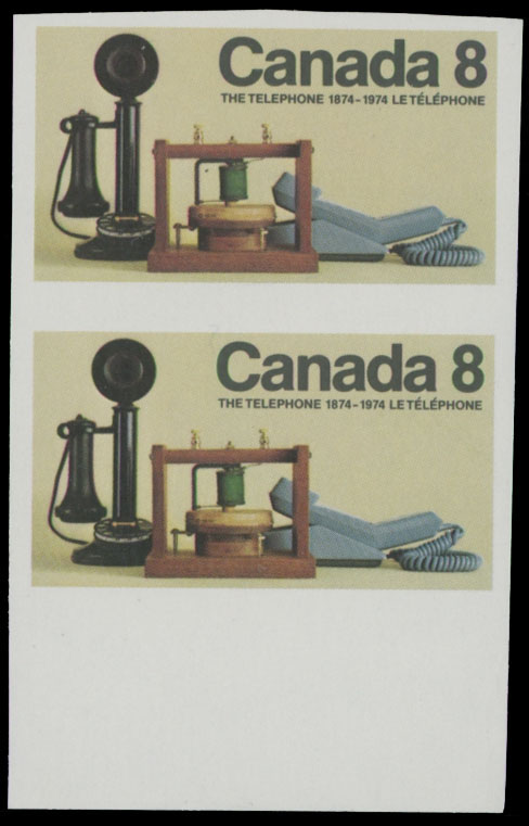 1974, Telephone Centenary, 8c multicolored, bottom sheet margin vertical imperforate pair, full OG, NH, VF, only 100 imperf stamps were printed, C.v. $1,000, Unitrade C.v. CAD $2,000, Est. $400-$500 , Scott #641a