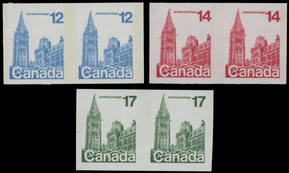 1978-79, Parliament Buildings, 12c blue, 14c red and 17c green, three horizontal imperforate pairs of coil stamps, full OG, NH, VF, C.v. $460, Unitrade C.v. CAD$625, Est. $150-$180 , Scott #729a-30a, 806a