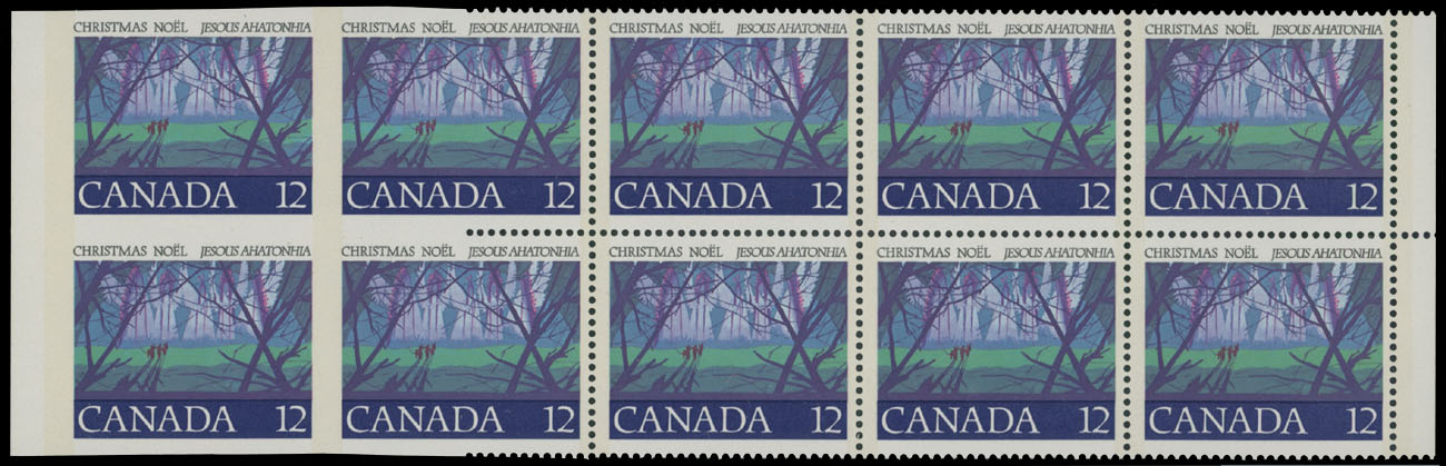 1977, Christmas, 12c multicolored, partially imperforate side margin block of ten (5×2), containing left vertical pair completely and second pair from the left partly imperforate, full OG, NH, VF and rare multiple, C.v. $1,750, Unitrade C.v. CAD$2,500, Est. $1,000-$1,200, Scott #742a