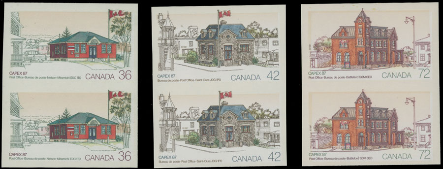 1987, CAPEX ’87, 36c, 42c and 72c, imperforate complete set of three in vertical pairs (34c doesn’t exist imperf), full OG, NH, VF and very rare, only one pane of 50 for each value was printed, Est. $1,500-$1,800 , Scott #1123-25 imp