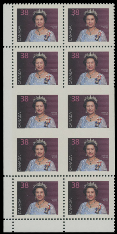 1988, Queen Elizabeth II, 38c multicolored with red background, bottom left corner margin block of 10 (2×5), middle pair is imperf, while 2nd and 4th partly perf, full OG, NH, VF, Unitrade C.v. CAD$1,750, Est. $600-$700 , Scott #1164c