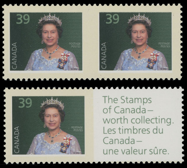 1990, Queen Elizabeth II, 39c multi with green background, horizontal pair imperforate between stamps, and a labeled single imperforate between stamp and label, full OG, NH, VF, Unitrade #1167d, di, C.v. $1,100, Est. $200-$250 , Scott #1167d, var