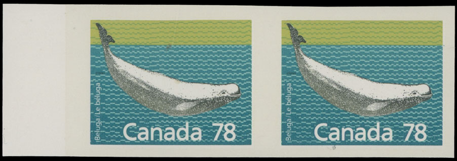 1990, Beluga Whale, 78c multicolored, left sheet margin imperforate horizontal pair, full OG, NH, VF, C.v. $850, Unitrade C.v. CAD1,200, Est. $250-$300 , Scott #1179d