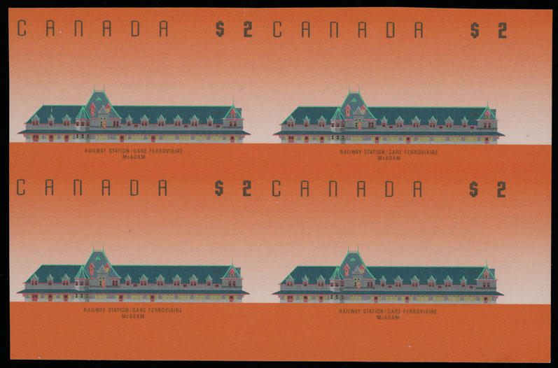 1989, McAdam Railway Station, $2 multicolored with orange background, bottom right corner sheet margin imperforate block of four, full OG, NH, VF and scarce multiple, C.v. $1,700++, Unitrade C.v. $2,500, Est. $750-$800 , Scott #1182a