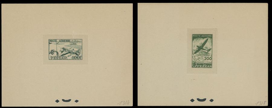 1948, View of Airport and Airplane over the Map, die sunk epreuves de luxe of 100fr and 200fr, both are in green with typical punctures and endorsed number instead of text at bottom right, no gum as produced, NH, VF and very rare, Sassone #PA1-2, Est. $500-$600, Scott #2NC1-2