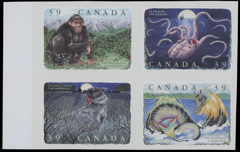1990, Legendary Creatures, 39c multicolored, imperforate left sheet margin se-tenant block of four, perfect quality, full OG, NH, VF, C.v. $1,250, Unitrade C.v. CAD$2,500, Est. $600-$700 , Scott #1292b