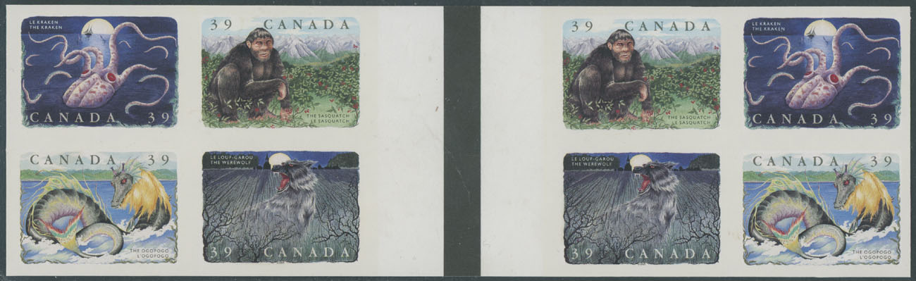 1990, Legendary Creatures, 39c multicolored, imperforate vertical gutter block of eight with vertical 10mm strip along the gutter, containing two se-tenant blocks of four, excellent condition, full OG, NH, VF, C.v. $2,500++, Unitrade C.v. CAD$5,000 as two separate blocks, Est. $2,000-$2,500, Scott #1292b
