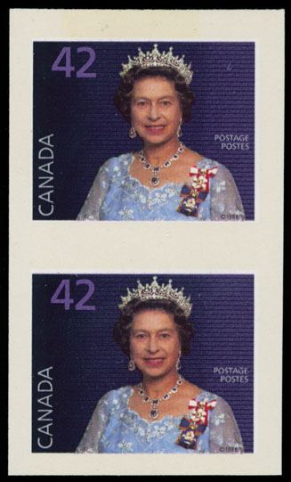 1991, Queen Elizabeth II, 42c multicolored with background in purple, four-side margins vertical imperforate pair, full OG, NH, VF, C.v. $575, Unitrade C.v. CAD$1,000, Est. $300-$350 , Scott #1357b