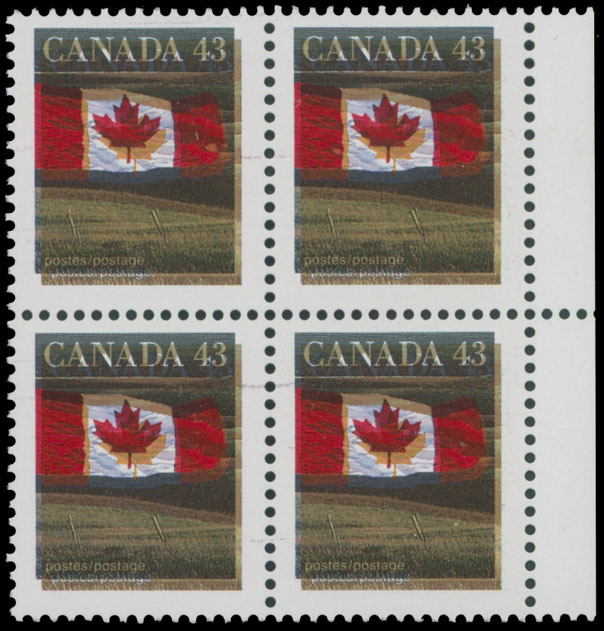 1992, Flag over the Field, 43c multicolored, double impression of red and gray lilac colors, right sheet margin block of four, full OG, NH, VF, Unitrade #1359ii, Est. $400-$450 , Scott #1359 var