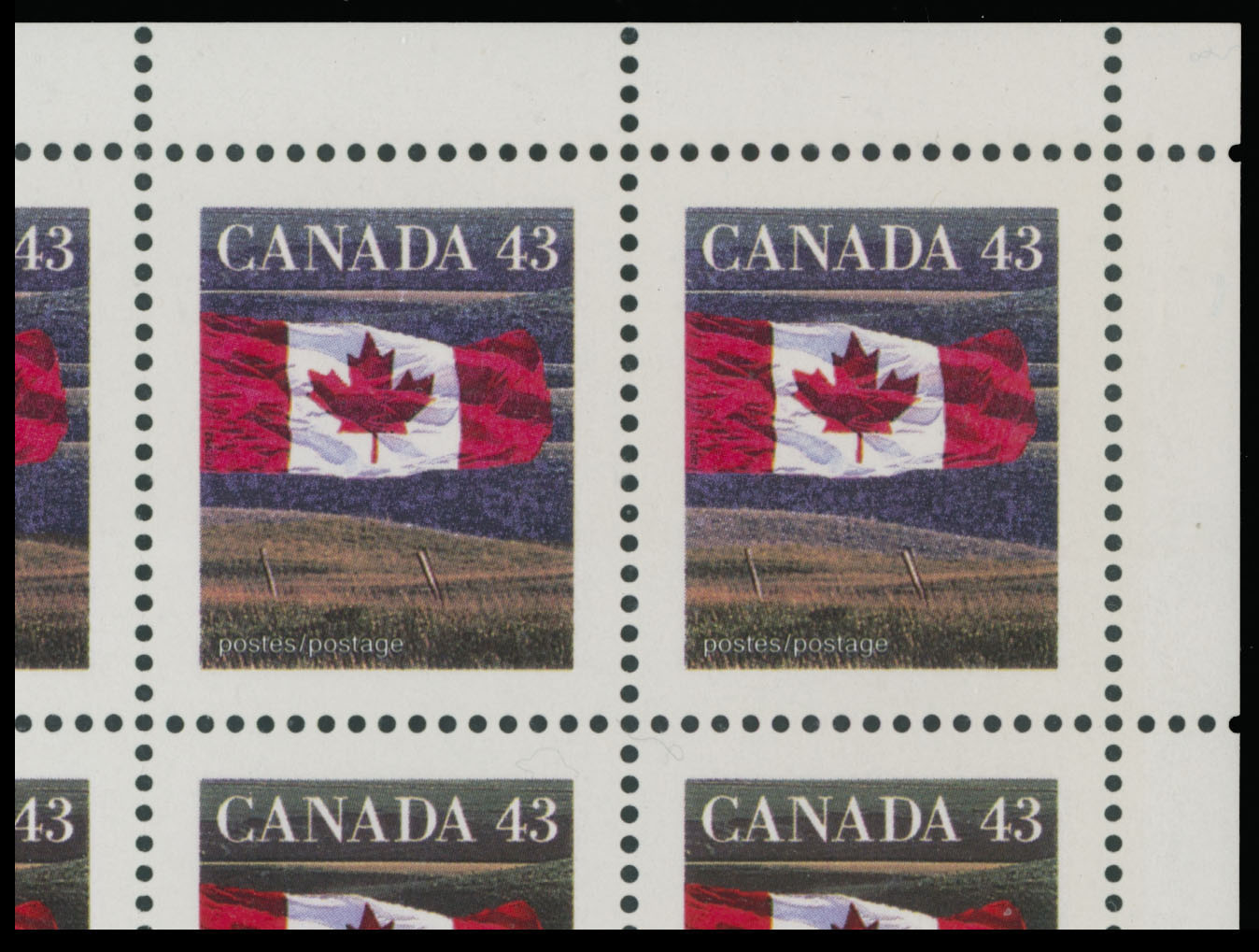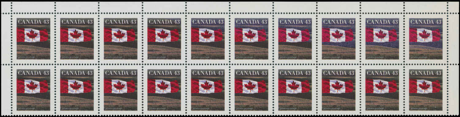1992, Flag over the Prairie, 43c multicolored, ”repellex variety” with color changing at top, three-side margin transition block of 20 (10×2, top part of a sheet) with six stamps at upper row showing blue black instead of green black color of the background, full OG, NH, VF and a spectacular item, Est. $300-$350, Scott #1359, var