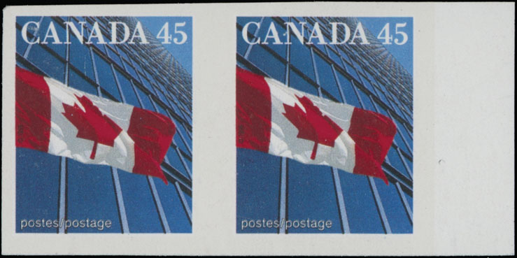 1998, Flag over the Building, 45c multicolored, stamp size 20x24mm, right sheet margin horizontal imperforate pair, full OG, NH, VF, C.v. $450, Unitrade C.v. CAD$750, Est. $200-$250 , Scott #1362c