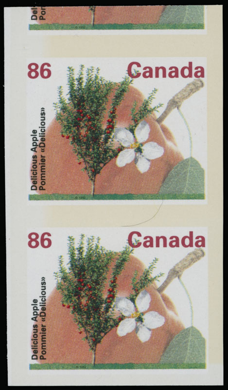 1991, Delicious Apple, imperforate essay of unissued denomination of 86c, design used for stamp of 49c, vertical pair with a part of adjoined stamp at top, full OG, NH, VF and rare, Unitrade C.v. CAD$2,000, Est. $600-$700 , Scott #1364