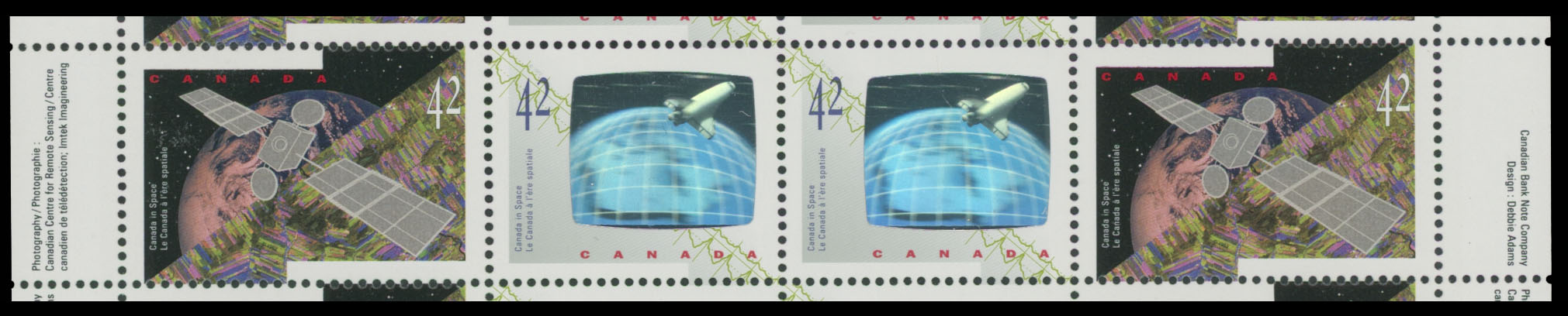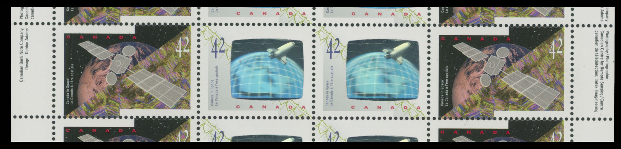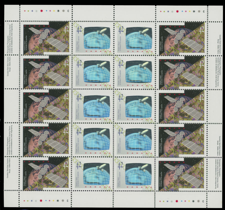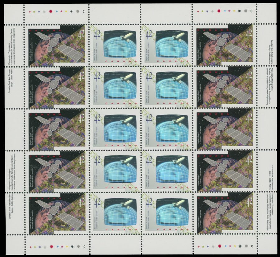 1992, Canada in Space, pane containing ten se-tenant pairs of 42c multi and 42c multi with hologram, two panes, each one has either second or fourth row of hologram stamps with a ”Black Hole” (black line beneath the Earth), full OG,NH, VF, Unitrade #1442v, C.v. CAD $800++, Est. $150-$200, Scott #1442a var