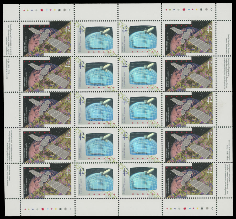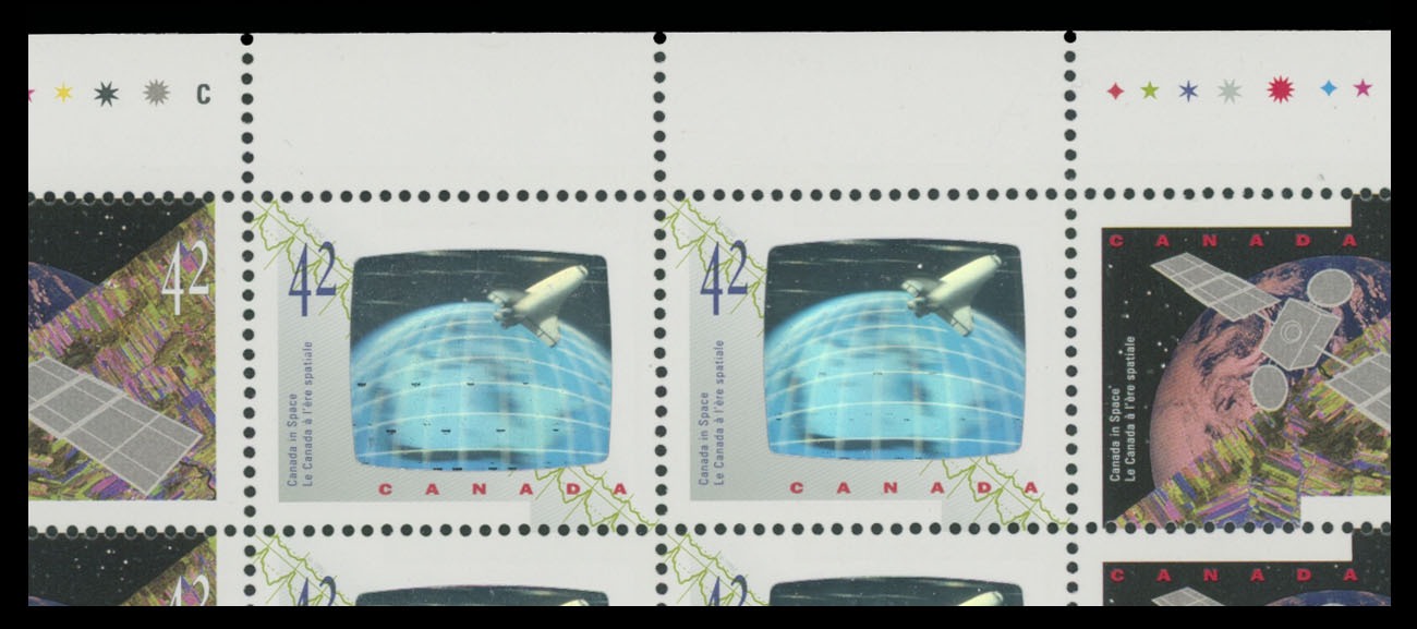 1992, Canada in Space, pane containing ten se-tenant pairs of 42c multi and 42c multi with hologram, all hologram stamps at left and at least two at right representing ”Meteor Shower” variety (black streaks on the Map), full OG, NH, VF, Unitrade #1442vi, C.v. CAD $1,400, Est. $200-$250, Scott #1442a var