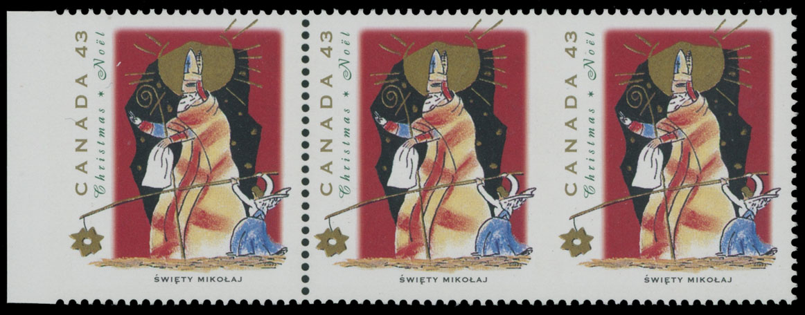 1993, Christmas, Swiety Mikolaj, 43c multicolored, left sheet margin horizontal strip of three, imperforate on the left between stamp and margin and between middle and right stamps, full OG, NH, VF and rare multiple, Unitrade #1499b, ii, C.v. CAD$2,200 as single errors, Est. $600-$700, Scott #1499b, var