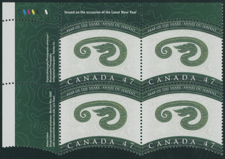 2001, Year of the Snake, 47c multicolored, gold omitted, top left corner sheet margin block of four, full OG, NH, VF and rare multiple, C.v. $5,600 as singles, Unitrade C.v. CAD$9,500, Est. $4,000-$4,500 , Scott #1883a