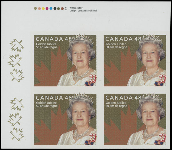 2003, Queen Elizabeth II, Golden Jubilee, 48c multicolored, top left corner sheet margin plate No. imperforate block of four, control lights at upper selvage, full OG, NH, VF, C.v. $2,200++, Unitrade C.v. CAD$4,000, Est. $1,000-$1,200 , Scott #1932a