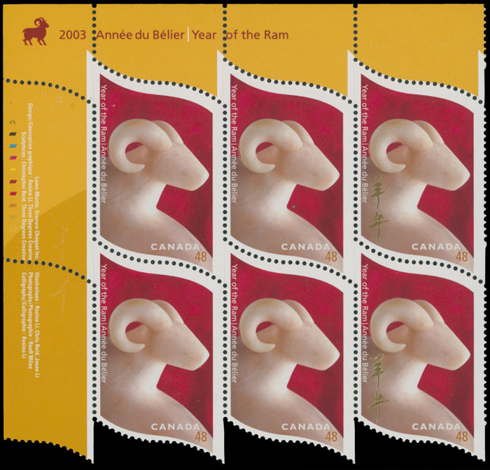 2003, Year of the Ram, 48c multicolored, top left corner sheet margin block of six (3×2), stamps of block of four on the left with omitted gold inscription in Chinese, full OG, NH, VF, Unitrade C.v. CAD$2,500, Est. $800-$900 , Scott #1969a