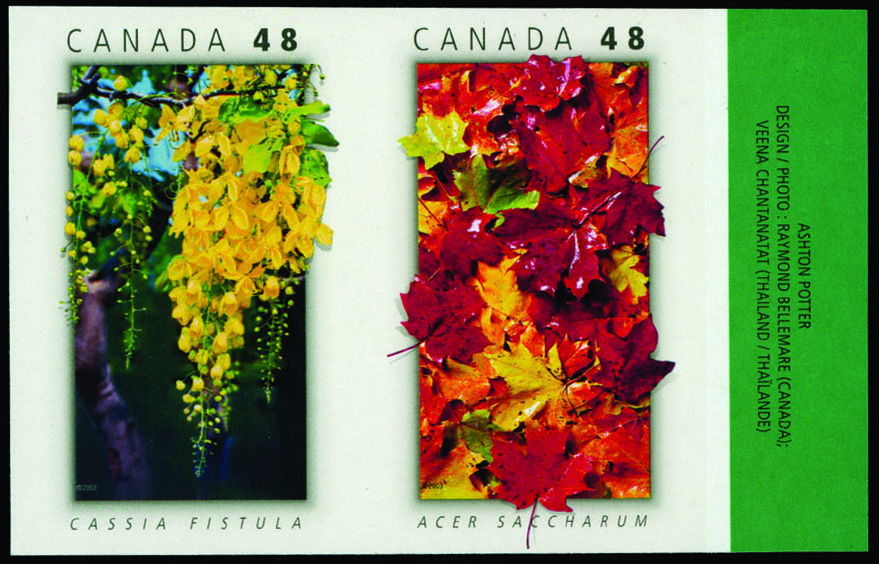 2003, Trees of Canada and Thailand, right sheet margin horizontal se-tenant imperforate pair of 48c + 48c multi, imprint on selvage, full OG, NH, VF, C.v. $900, Unitrade C.v. CAD$1,250, Est. $300-$350 , Scott #2001c