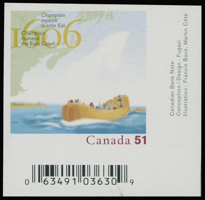 2006, 400th Anniversary of Exploration of East Coast by Samuel de Champlain, 51c multicolored, bottom right corner sheet margin imperforate single with black engraving omitted, selvage imprint and barcode, full OG, NH, VF and rare, only two panes of 16 were discovered, therefore only two such positional pieces possible, Unitrade #2155 footnote, Est. $600-$700, Scott #2155 var