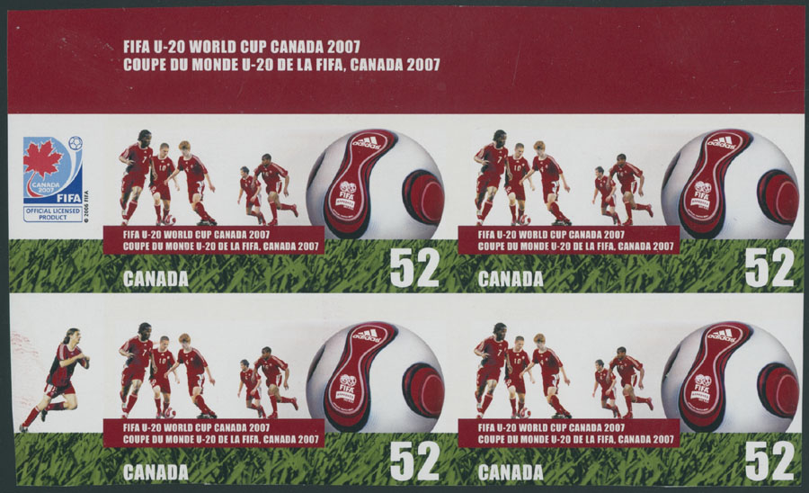 2007, FIFA U-20 World Youth Championships, 52c multicolored, top left corner sheet margin imperforate block of four, inscription at the top and World Cup Emblem on the left selvages, full OG, NH, VF, C.v. $1,900, Unitrade C.v. CAD$2,600 as two pairs, Est. $800-$900, Scott #2220a