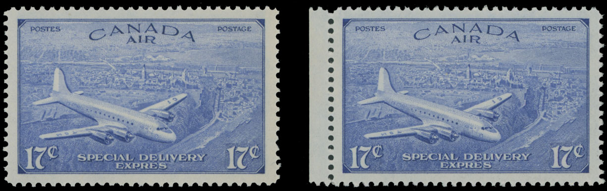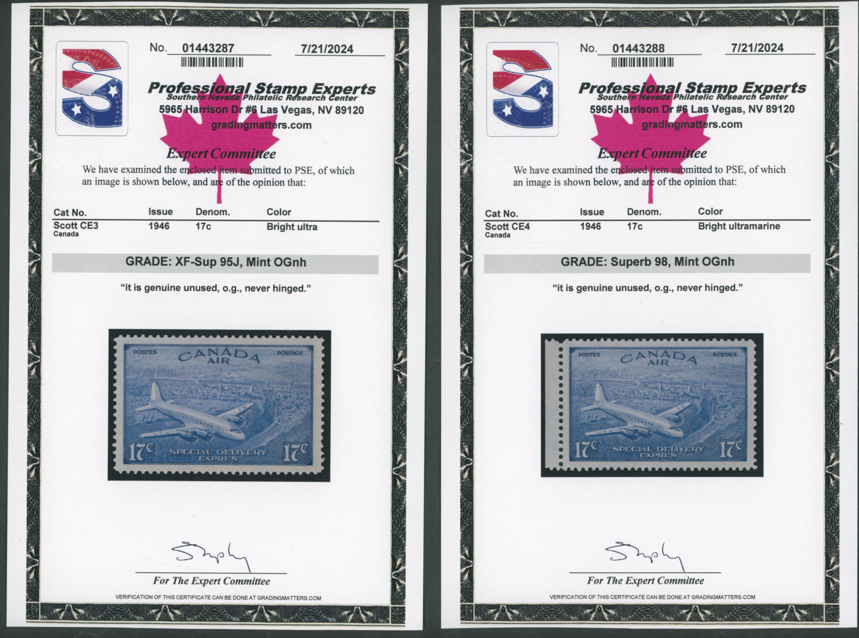 1946, Airplane D.C.4-M, two stamps of 17c blue, incorrect accent and revised issues, full OG, NH, XF-SUP95J and SUP98, two PSE certificates, Est. $150-$180 , Scott #CE3-4