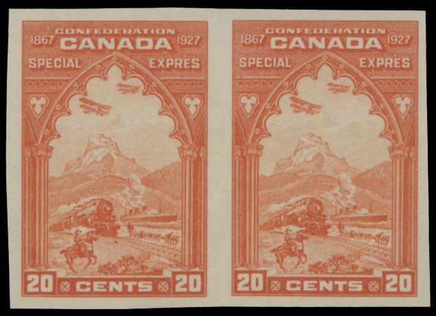 1927, Confederation, 20c orange, horizontal imperforate pair, full OG, NH, VF, C.v. $380, Unitrade C.v. CAD$500, Est. $150-$180 , Scott #E3a