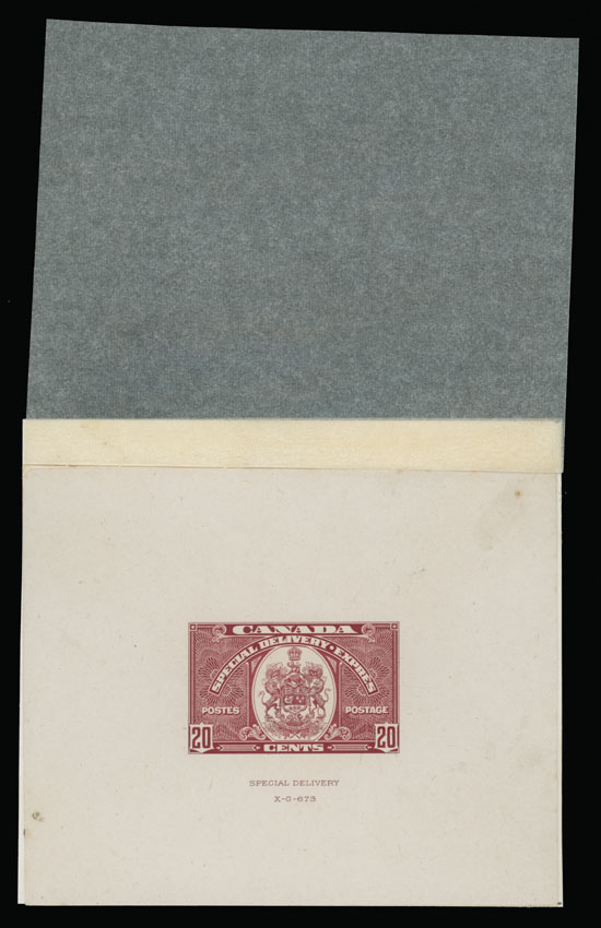 1938, Coat of Arms, large die proof of 20c in dark carmine, imprint ”Special Delivery” and ”X-G-673” at bottom, proof size 105x85mm, printed on India paper and mounted on slightly enlarged card with protective paper at top, negligible soiling spots at bottom left and top right, no gum as produced, VF and rare, Minuse and Pratt #E8 P1, NSSC SD7dp2, C.v. US$2,000, Est. $750-$800, Scott #E8