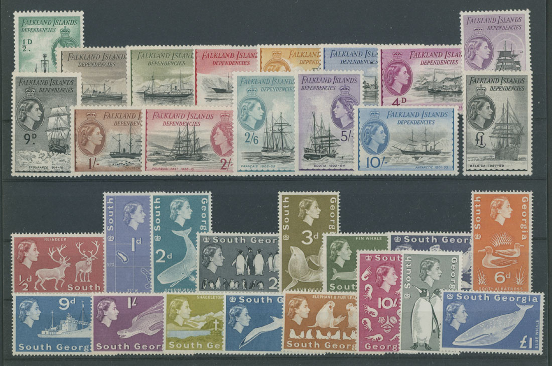 1954-62, Queen Elizabeth II and Ships, ½p-£1, complete set of 15, in addition the first set of South Georgia, Queen Elizabeth II, Animals, Birds (Sc. #1-16), complete set of 16, both with full OG, NH, VF, C.v. $446, SG C.v. £425 for both sets, Est. $250-$300, Scott #1L19-33