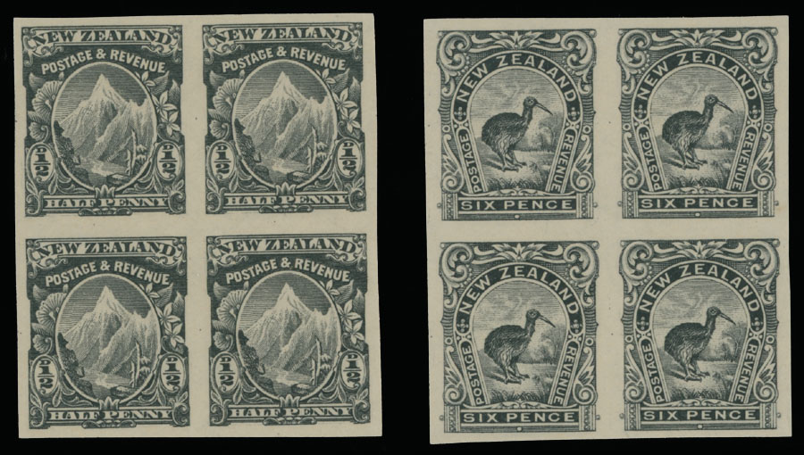 1898, Mt. Cook ½p and Kiwi 6p, two engraved imperforate plate proofs in black, blocks of four printed on wove paper without watermark, no gum as produced, NH, VF, Est. $300-$350 , Scott #70, 78