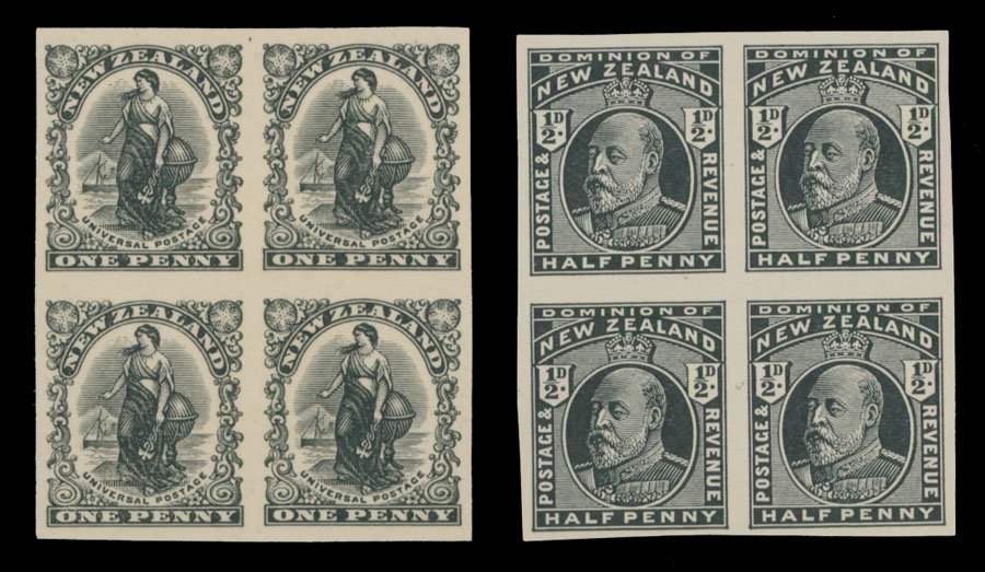 1901, Universal Penny Postage and King Edward VII, two imperforate plate proofs of typo printing for 1p and ½p in black, blocks of four printed on thin card or thickened glossy paper, no gum as produced, NH, VF, Est. $300-$350 , Scott #129-30
